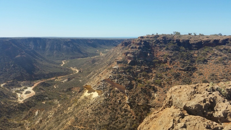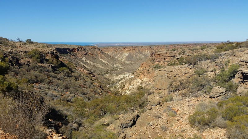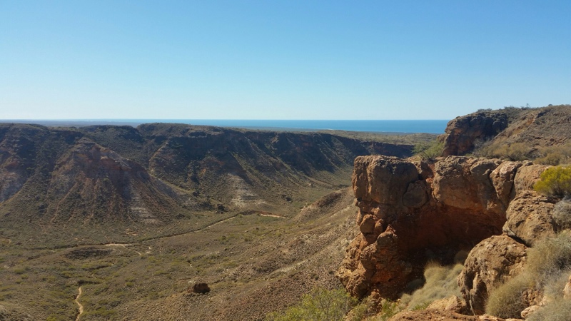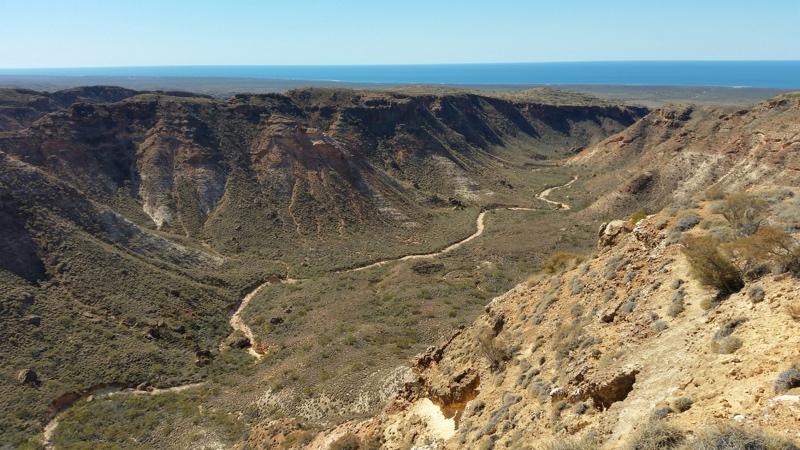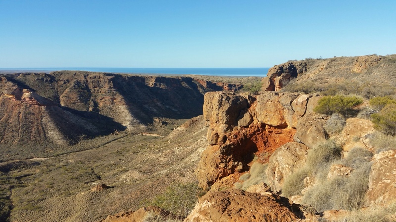 Shot Hole Canyon. Only accessible by 4WD below or across from Charles Knife Canyon by 4WD and a hike above. In our case, it was more hiking, even though some intrepid (or stupid) tourists tackled the track in 2WD vehicles. Not in our bus though, that would have been complete madness. In any case, the pictures and views were special. All sea is the water to the east and south of Exmouth on the gulf, not Indian Ocean.