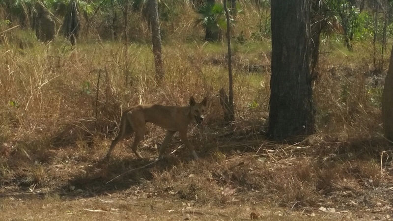 Rock art in Ubirr. The image suggests the ‘Tasmanian Tiger’ once lived in these parts but was displaced further south by the arrival of the dingoes, and to their eventual extinction.