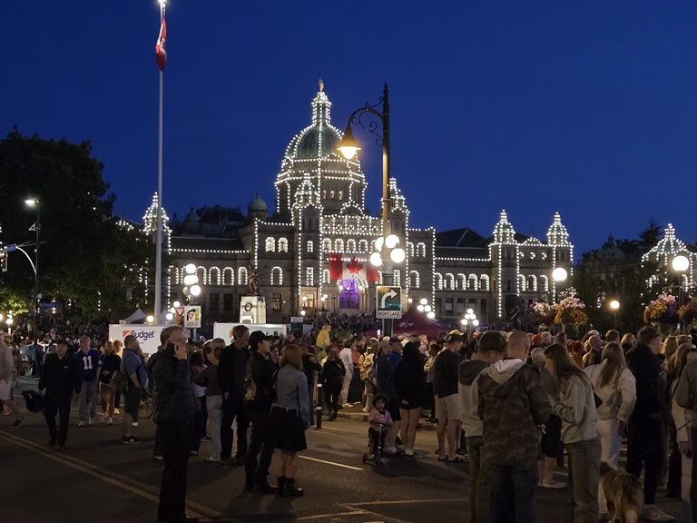 Today was a quick flight from Vancouver to Victoria (about 20 mins airborne), then we arrived in the special area of Victoria. To explore more tomorrow, while tonight was festivities right outside our hotel, including the Victoria Symphony orchestra and late evening fireworks. A very gentle and friendly crowd.